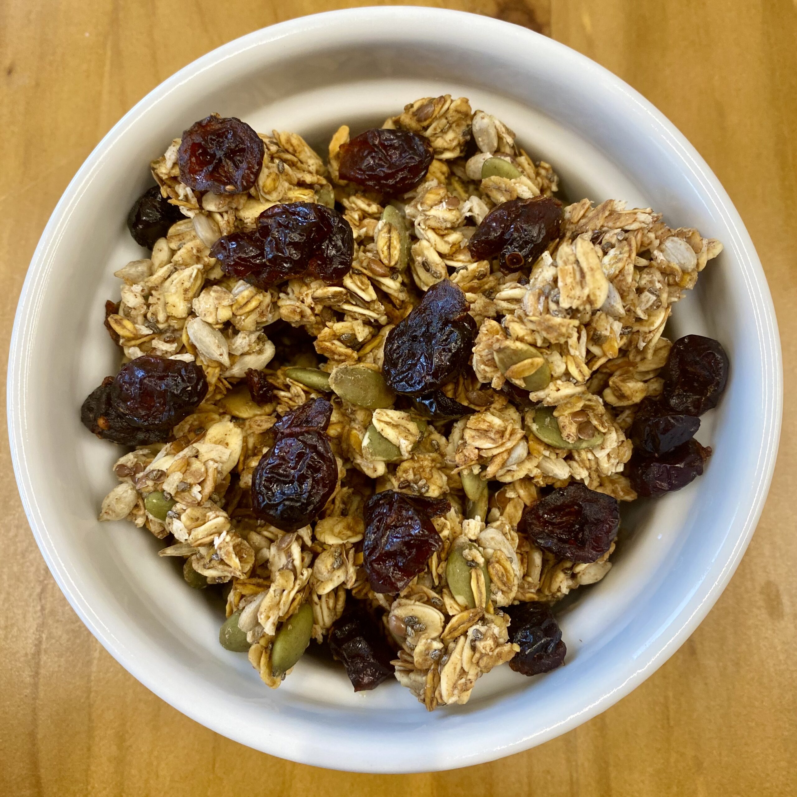 Ingredients: Rolled oats, rolled Kernza, dried cranberries, sourdough starter (flour, whole wheat flour, water), maple syrup, sunflower seeds, pumpkin seeds, coconut, coconut oil, flax seeds, chia seeds, cinnamon, salt.