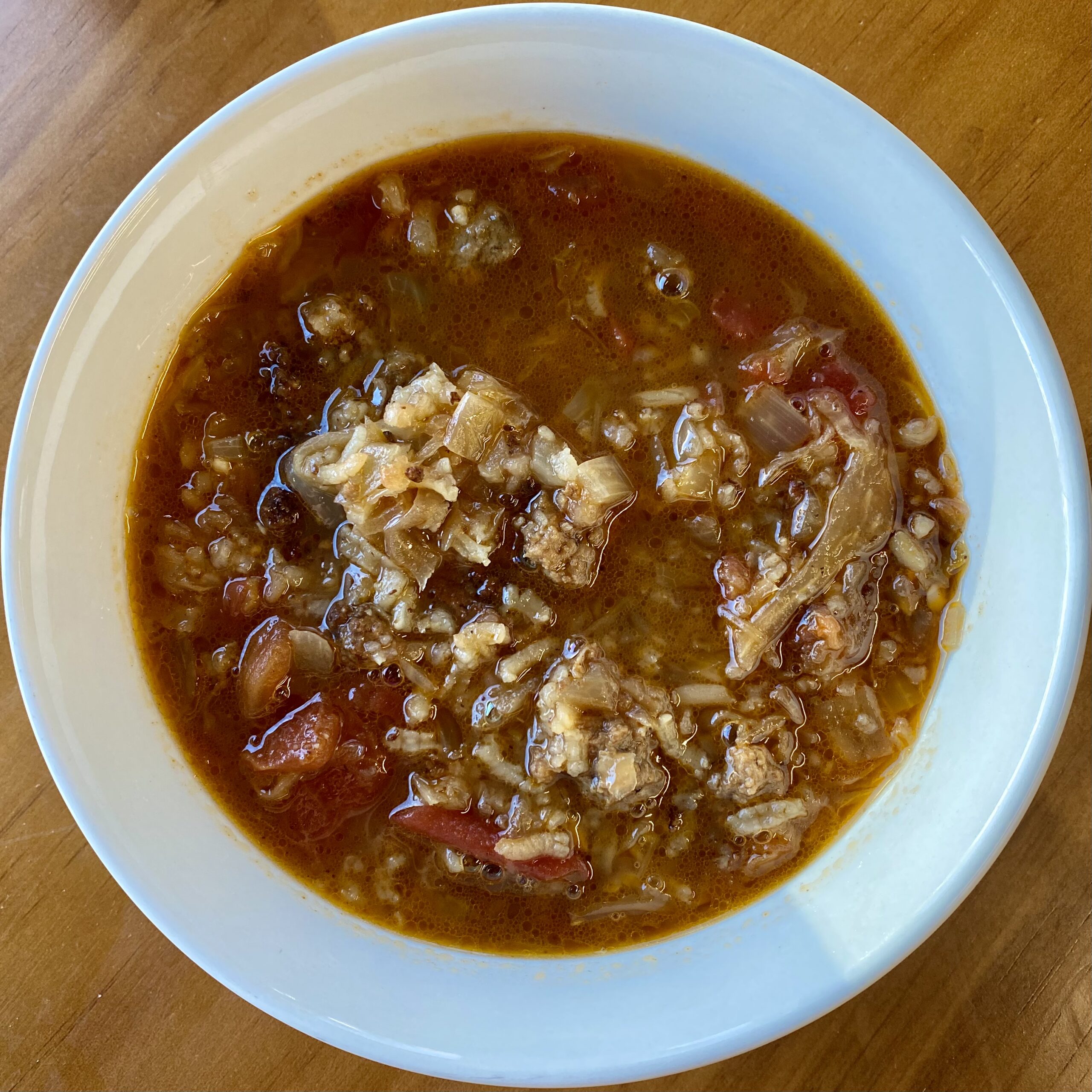 Ingredients: Water, local ground beef, bell peppers, local onion, tomatoes, organic tomato sauce (Organic Tomato Puree (Water, Organic Tomato Paste), Less Than 2% of: Sea Salt, Organic Red Pepper, Citric Acid.), organic brown rice, organic olive oil, garlic, Better Than Bouillon Organic Beef Base (Roasted Beef*, Salt, Cane Sugar*, Maltodextrin*, Garlic Powder*, Yeast Extract, Celery Juice Concentrate*, Food Starch*, Onion Powder*, Caramel Color*, Natural Flavor. *Organic), parsley, basil, oregano, salt, pepper