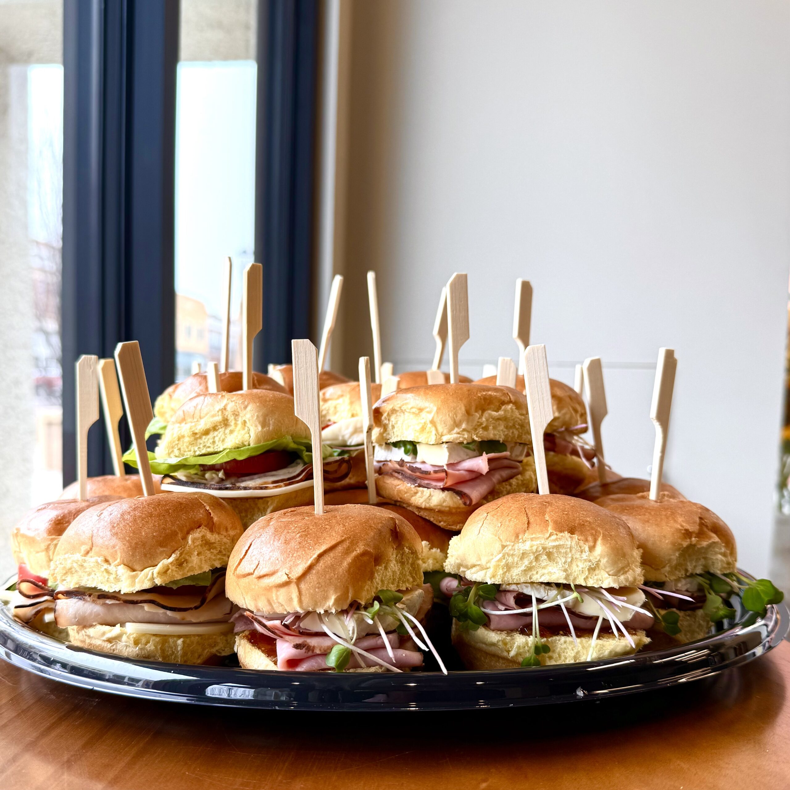 Choice of Ham & Brie, Deli Turkey, Curried Chicken Salad, or Caprese. Per dozen.