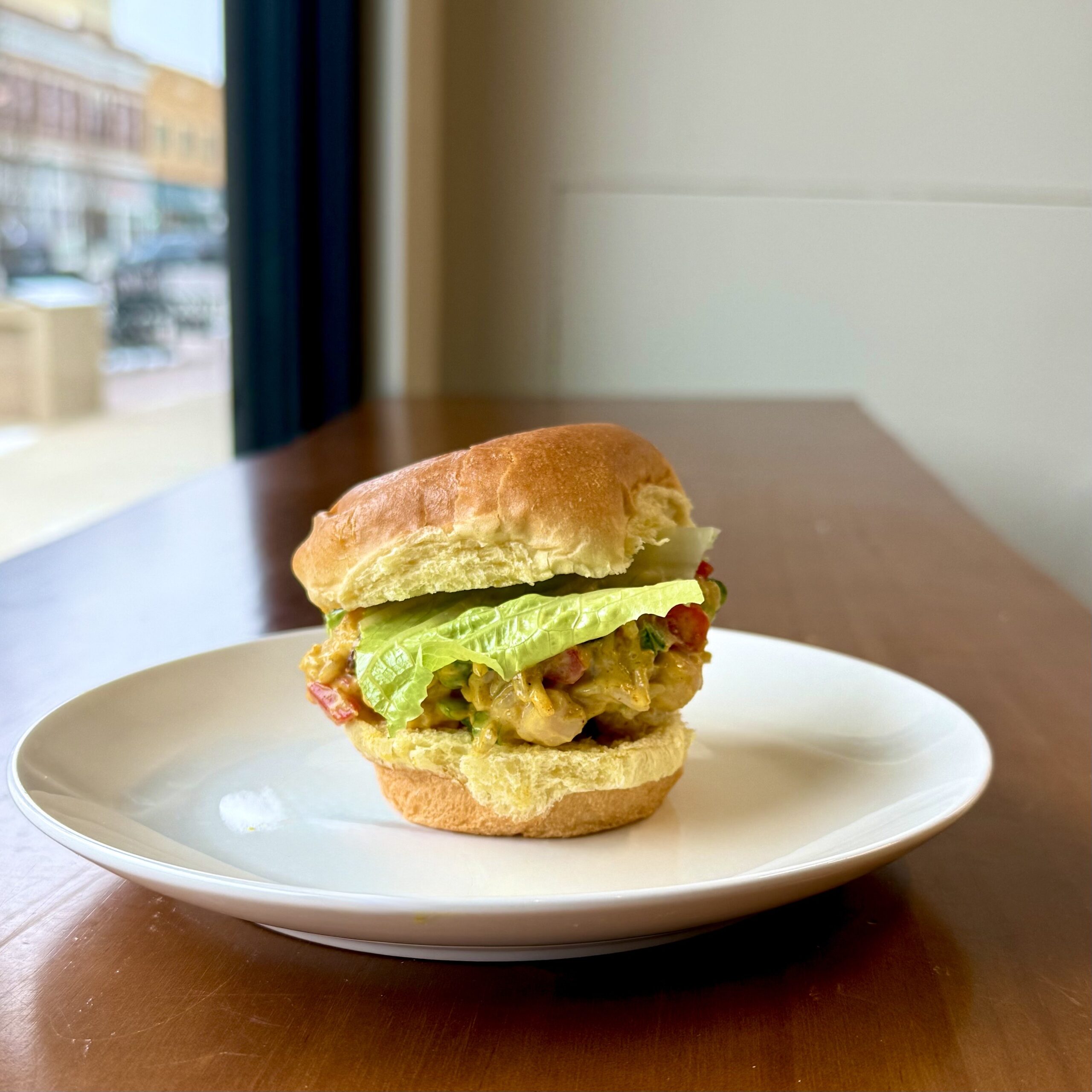 Curried Chicken Salad - Shredded local chicken, scallions, snap peas, bell pepper, brown rice, raisins, & curry chutney aioli